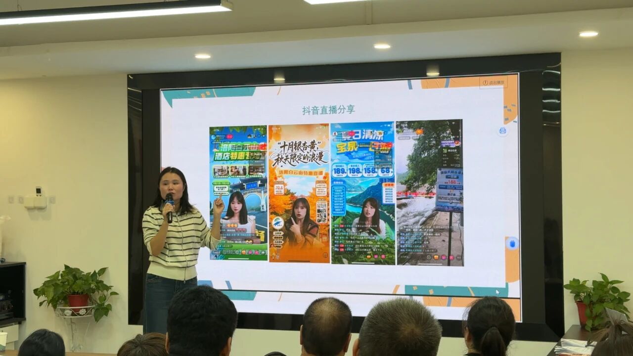 随后,集团电商部负责人杨云系统介绍了抖音直播的入门知识,涵盖账号定位、脚本设计、场景搭建、直播话术、流量获取等多个方面,帮助参训人员掌握旅游行业直播的基本逻辑,消除“不会播、不敢播”的顾虑。